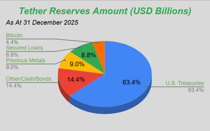 Tether’s reserves are heavily weighted toward highly liquid U.S. government debt, though the company maintains significant positions in alternative “hard” assets.